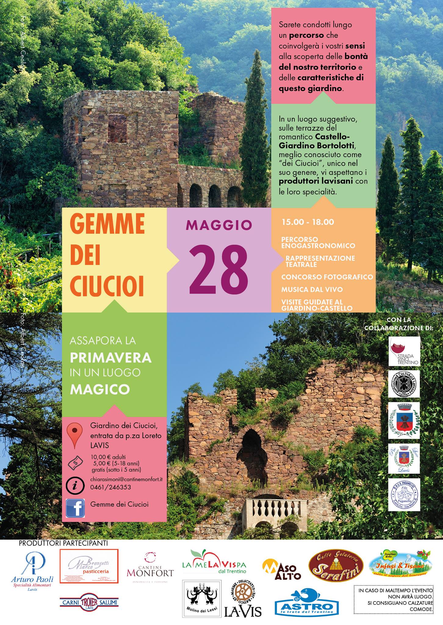 Sulle terrazze del romantico Castello- Giardino Bortolotti, meglio conosciuto come “dei Ciucioi” unico nel suo genere e che sta piano piano riprendendo le forme originarie, sarete condotti lungo un percorso che coinvolgerà i vostri sensi alla scoperta delle bontà del nostro territorio e delle caratteristiche di questo complesso. Potrete soddisfare il vostro palato e dare lustro ai vostri occhi camminando alla scoperta del Castello – Giardino. Un intrattenimento musicale un uno spettacolo teatrale completeranno un pomeriggio all’insegna del gusto, della cultura e del buon stare assieme.