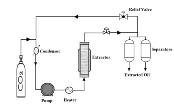 Scelta delle condizioni operative. Per la scelta della portata di CO2, ci siamo basati sull’equazione di del Valle e Aguilera (doi.org/10.1021/ie00080a036), che fornisce la solubilità di olii in CO2 supercritica in funzione delle condizioni operative. A 300 bar e 60 °C, questa risulta essere di circa 11.3 g olio/kgCO2. Ipotizzando che la farina abbia un tenore di olio pari a circa il 10%, e quindi che debbano essere estratti circa 5 g di olio, sarebbero necessari circa 442 g di CO2. Se si ipotizza che la CO2 esca dall’estrattore satura di olio, con una portata di 20 g/min l’estrazione può essere completata in circa 22 minuti