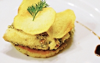 Millefoglie di trota iridea con melanzane, spressa filante, pomodoro e pesto leggero