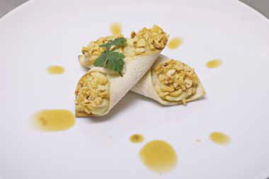 Preparare per tempo i cannoli: passare le fette di pane per tramezzini nella sfogliatrice fino allo spessore di 1 mm, tagliare dei quadrati di 5cm x 5cm per poi arrotolarli intorno agli appositi tubi in metallo saldando le giunzioni con uovo sbattuto. Friggere in olio d’arachide a 150° fino a doratura e lasciare raffreddare. (in