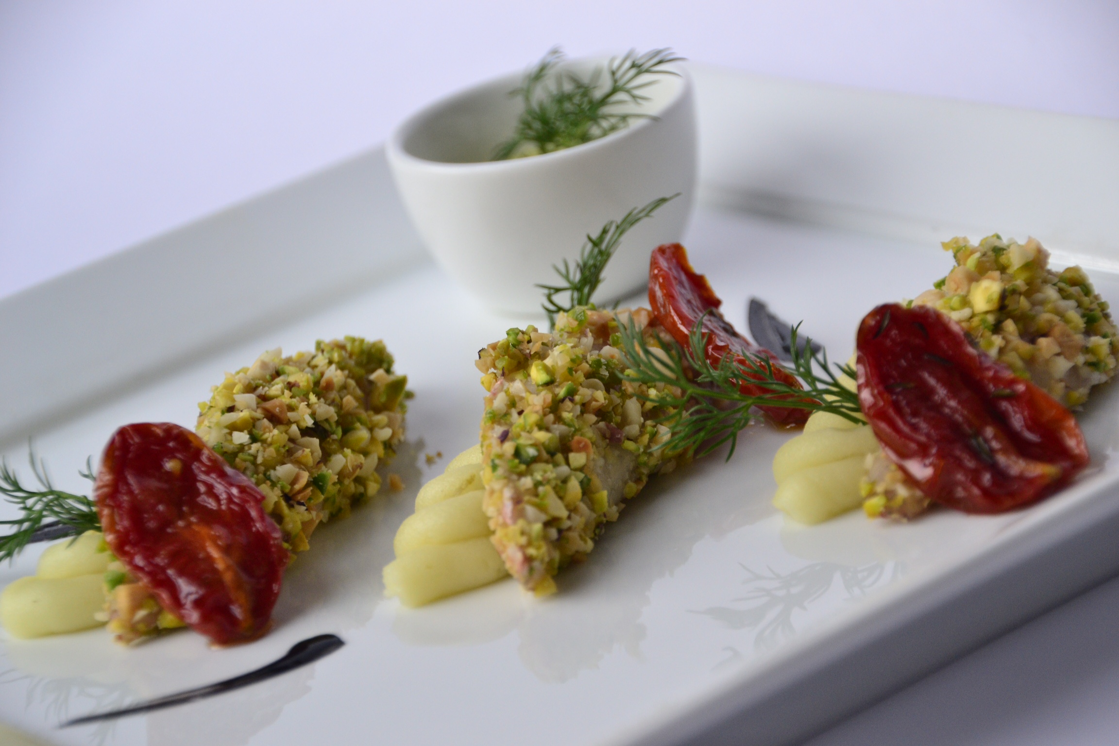 Sbucciare le mandorle e i pistacchi e tritarle grossolanamente. Nel frattempo cuocere le patate, passarle in planetaria, aggiungere il burro, il sale, e lentamente la panna fresca in modo da dare la giusta consistenza. A questo punto passare le darnette di salmerino nell’albume leggermente sbattuto, panarle con le mandorle e i pistacchi e posizionarle su una teglia con carta da forno.