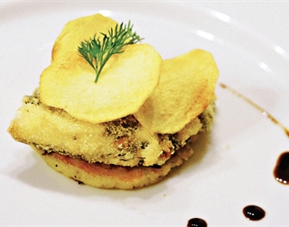 Millefoglie di trota iridea con melanzane, spressa filante, pomodoro e pesto leggero