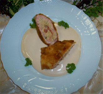 Aiutandosi con della pellicola trasparente appiattire i filetti rimanenti, poi coprirli con l'impsasto precedente e arrotolare i filetti. Togliere i filetti dalla pellicoladopo averli fatti riposare in frigo per 30 minuti circa, impanarli e friggerli nell'olio.