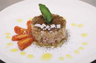 Aggiungerli a un trito a tagliere di capperi, una foglioline di menta a persona , mescolare il tutto alla polpa di salmerino tagliata a cubetti piccolissimi e regolari, a un filo d’olio e sale fino, se serve. Mescolare con cura.